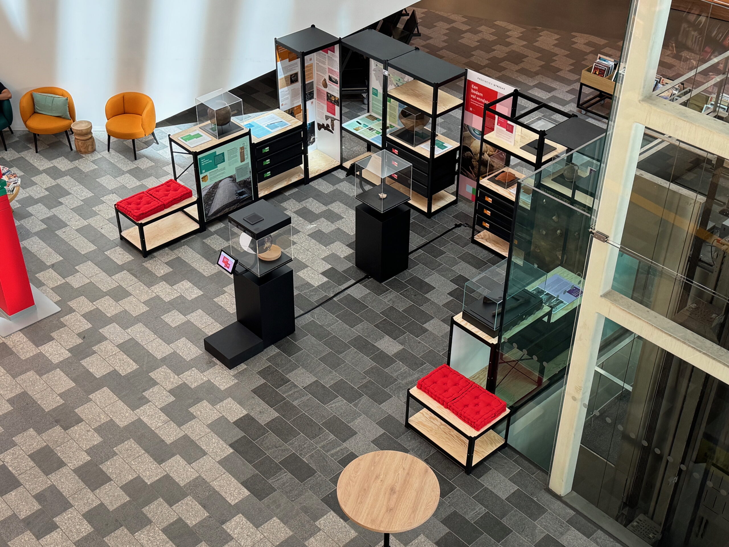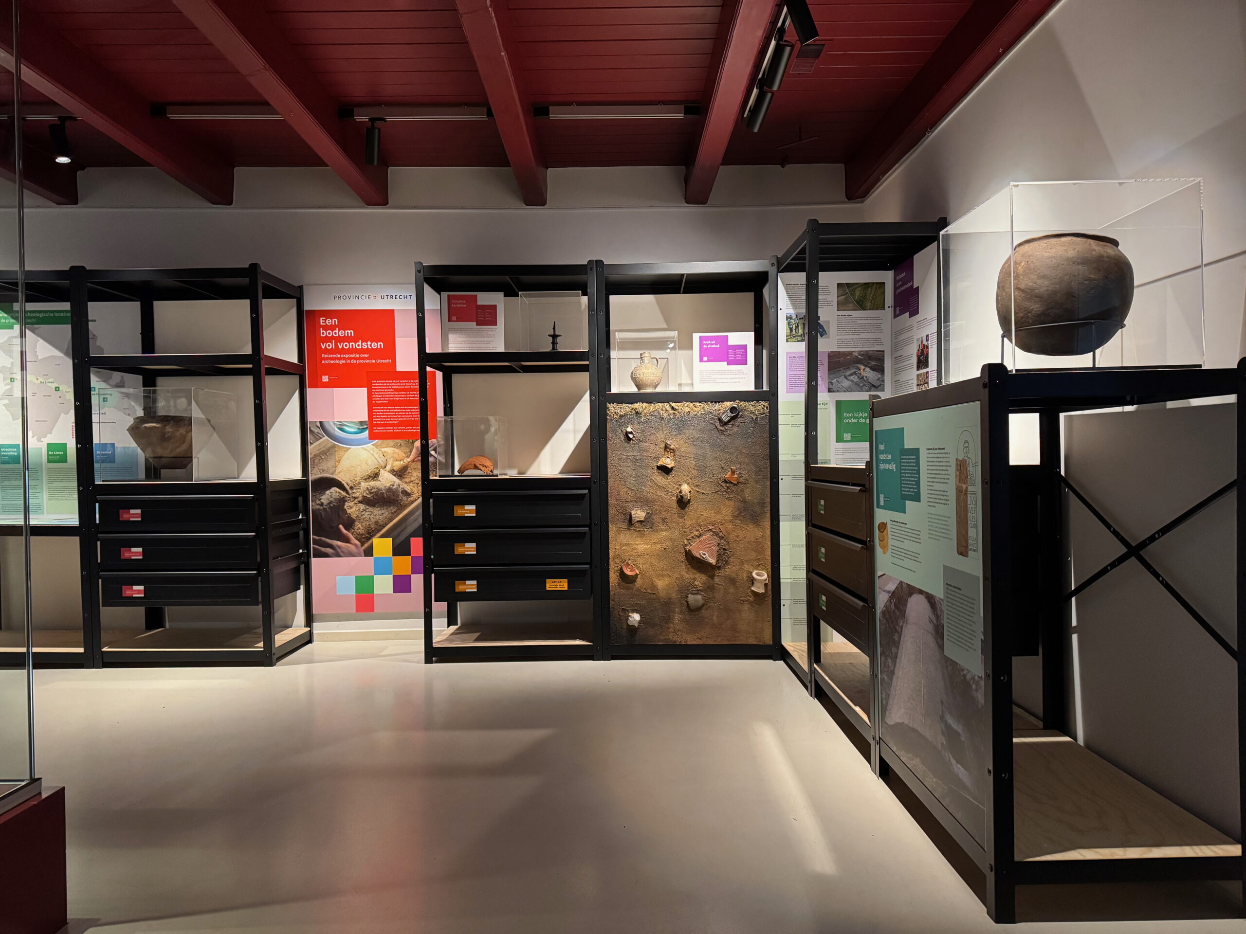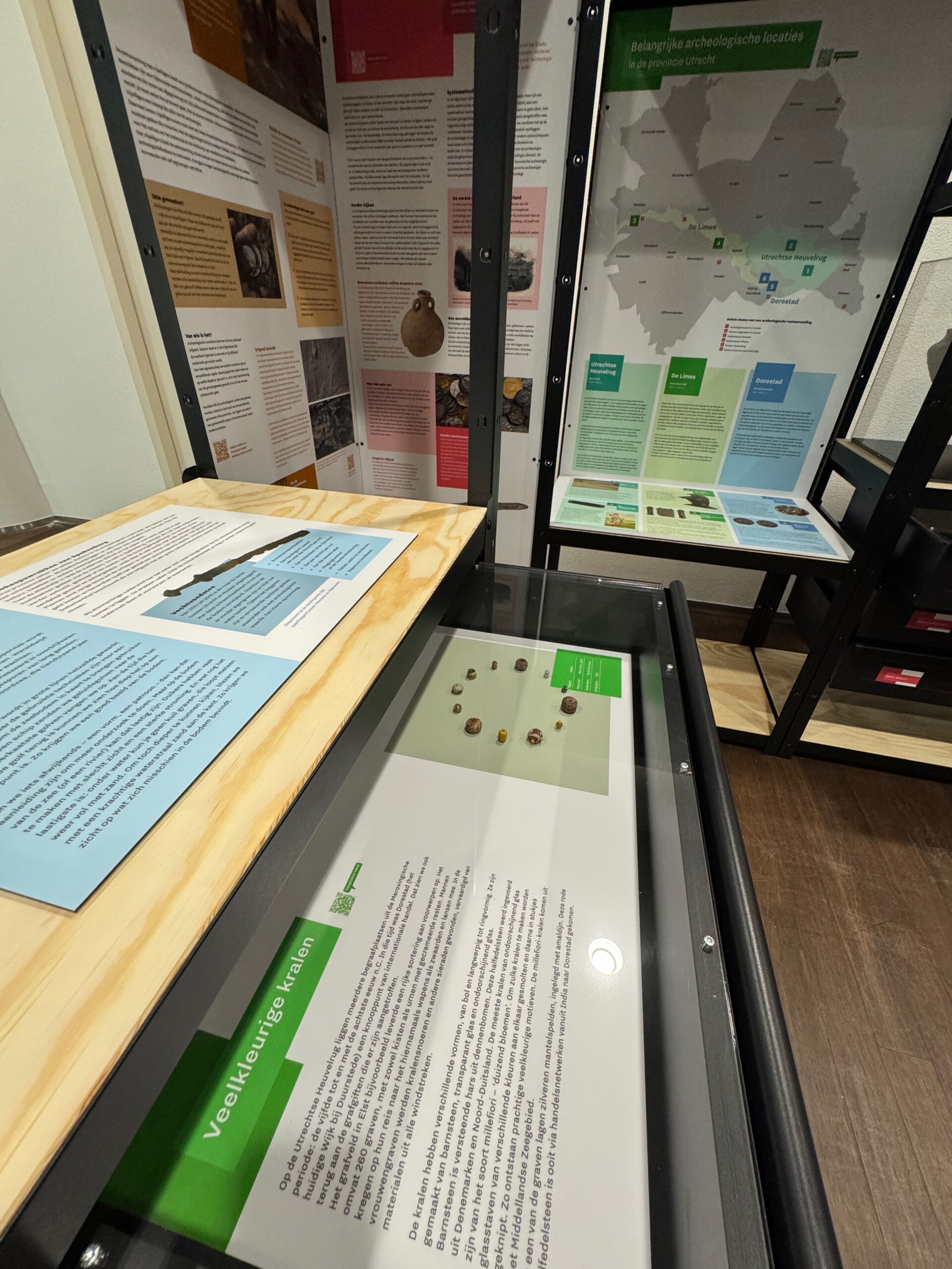 Daarnaast kan de opstelling aangepast worden aan de beschikbare ruimte. Of het nu gaat om een ruime museumzaal of een compacte hal in een gemeentehuis. Deze flexibiliteit zorgt ervoor dat de archeologische verhalen overal tot hun recht komen en dat iedere locatie een eigen unieke beleving kan bieden.