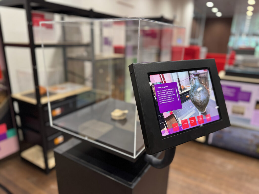 In de vitrine ligt een eenvoudige scherf van een amfoor. Door het scherm voor de vitrine te gebruiken, zie je hoe de scherf digitaal wordt aangevuld tot een complete amfoor. Terwijl je rond de vitrine loopt, blijft de reconstructie zichtbaar en kun je het object van alle kanten bekijken, alsof het echt voor je staat. Aan de hand van uiterlijke kenmerken en archeologische technieken wordt uitgelegd hoe onderzoekers kunnen achterhalen wat voor object het ooit was, welke functie het had en uit welke periode het afkomstig is. Zo wordt duidelijk dat zelfs een kleine scherf een sleutel kan zijn tot een groter verhaal.