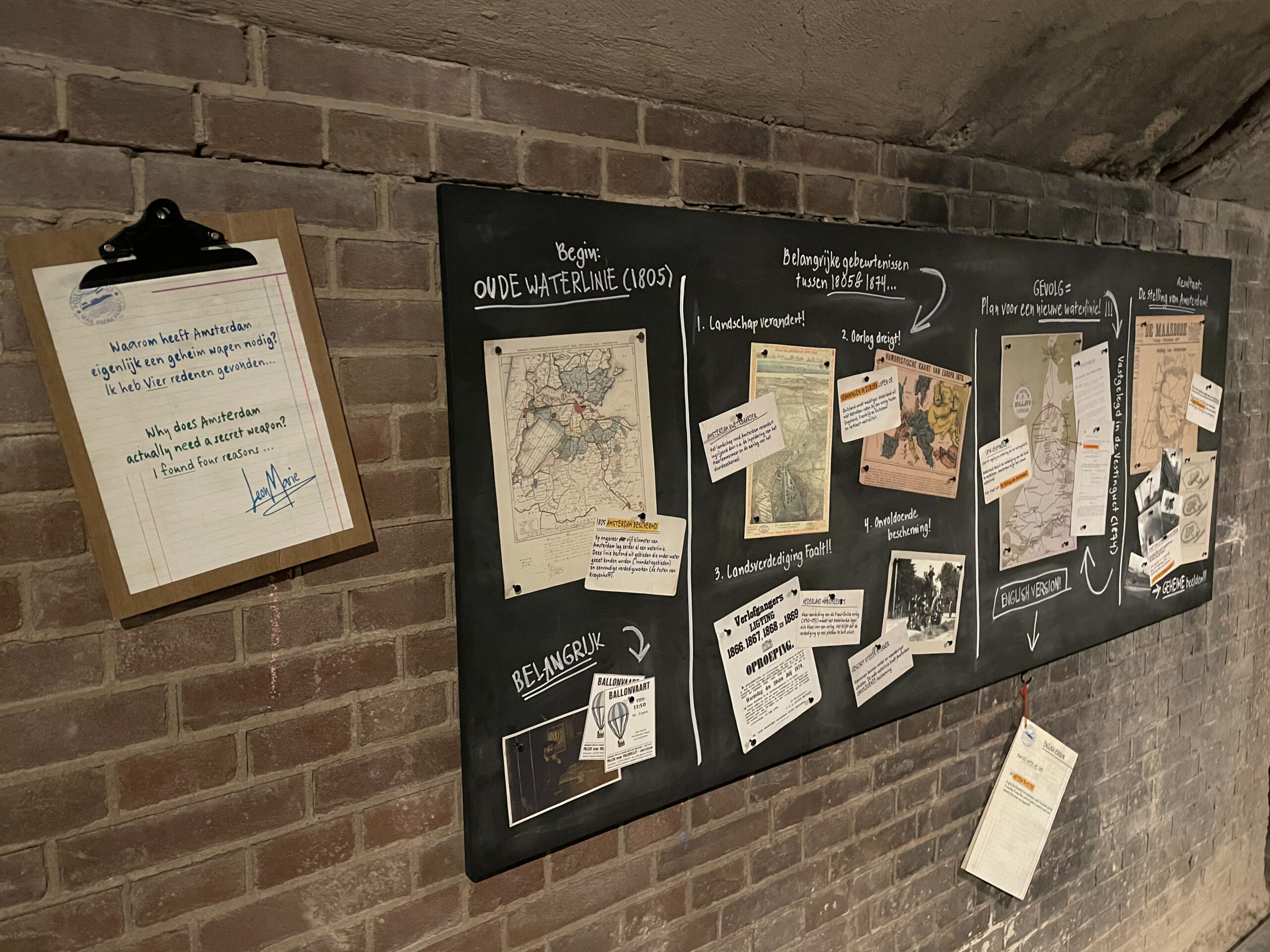 Oude kaarten en foto’s liggen verspreid, waarmee de strategische ligging van de Stelling wordt verduidelijkt. Een prikbord hangt vol met aantekeningen en weetjes die Leon onderweg niet mag vergeten te vertellen.