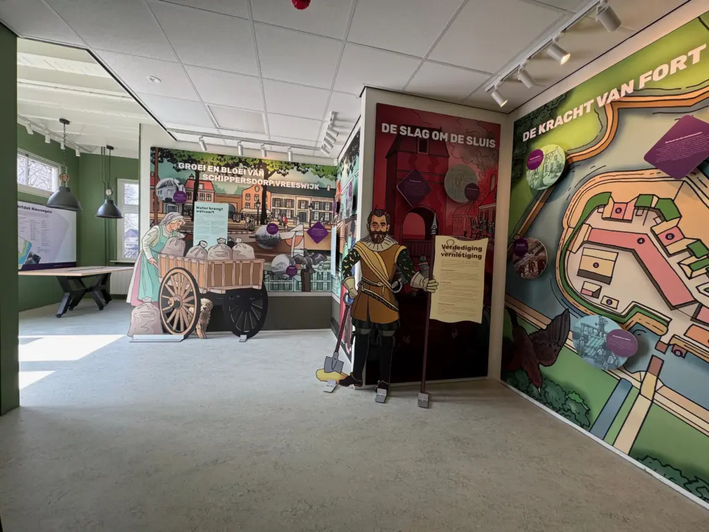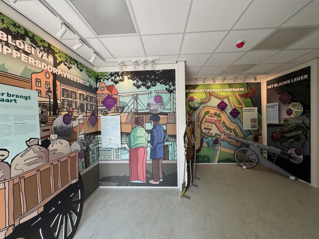 Wij nemen bezoekers mee op een tijdreis langs levensgrote illustraties die het verleden tot leven brengen. Van het ontstaan schippersdorp Vreeswijk tot de rol van Fort Vreeswijk en de waterlinies in de verdediging van Nederland: elke illustratie vertelt een verhaal dat je midden in de geschiedenis plaatst. Losstaande uitgesneden figuren geven een extra diepte in de wanden. Voor de illustraties zijn panelen toegevoegd met korte weetjes en verdiepende verhalen. Zo kan iedere bezoeker spelenderwijs leren over het strategische belang van het fort en de bijzondere rol van Vreeswijk in de scheepvaart.