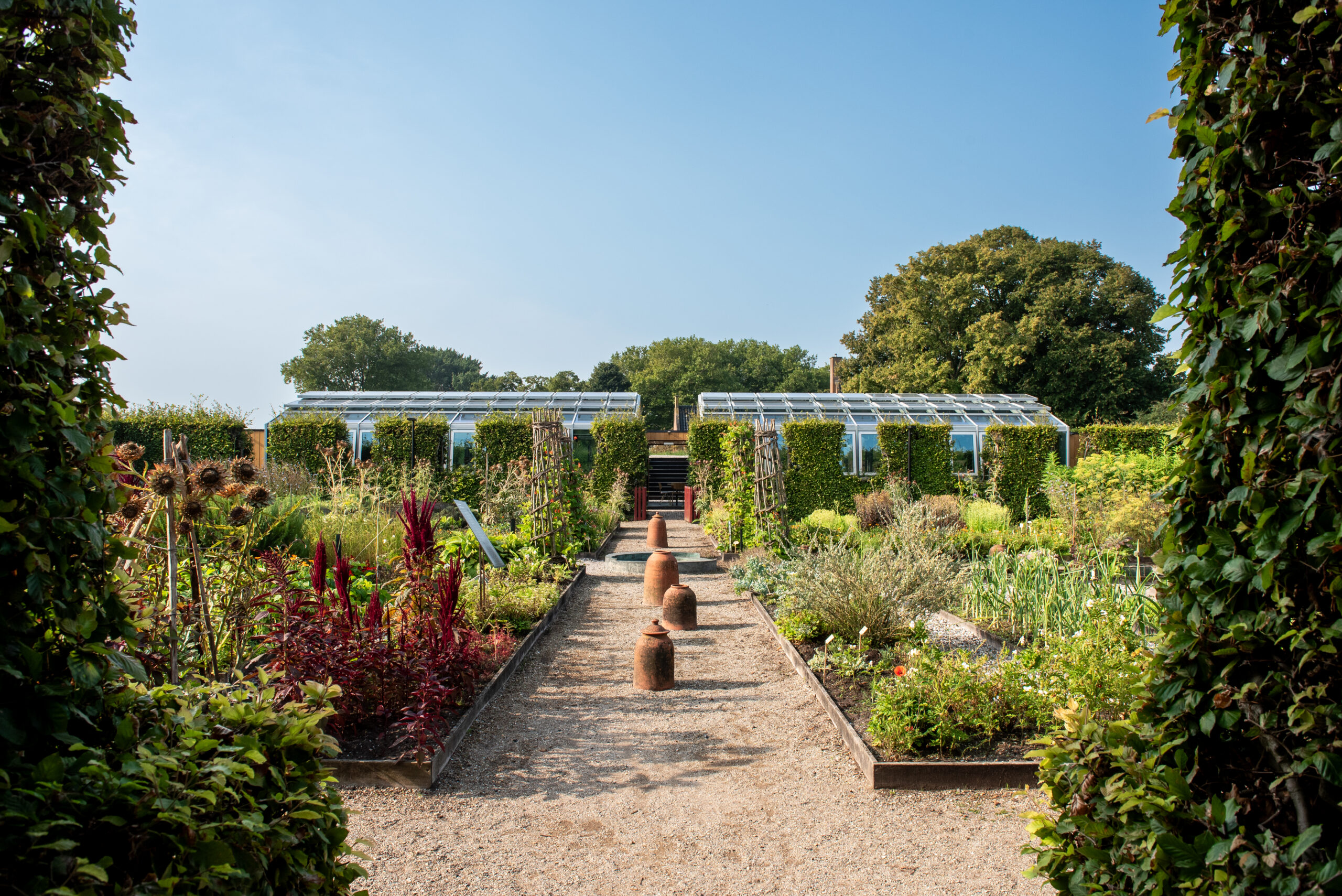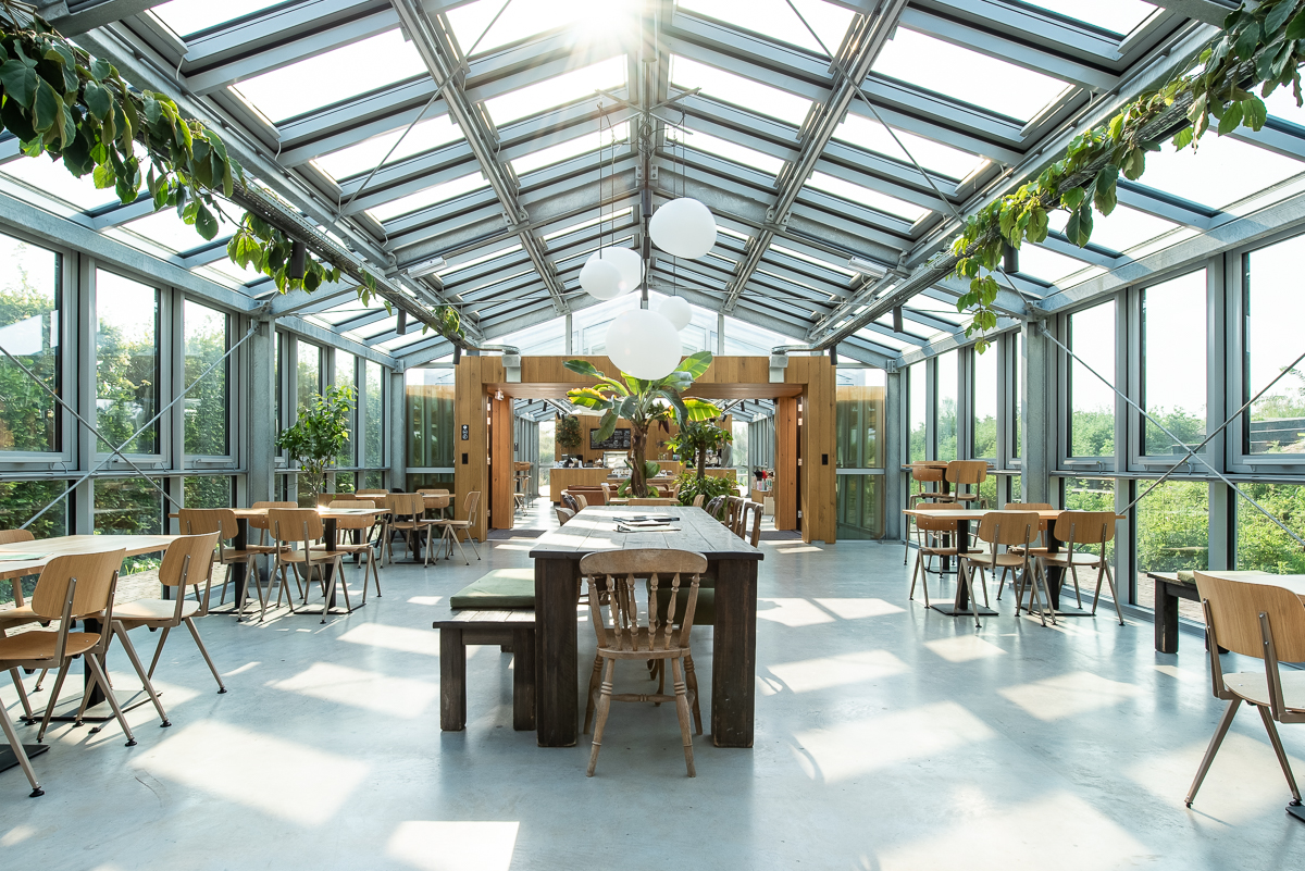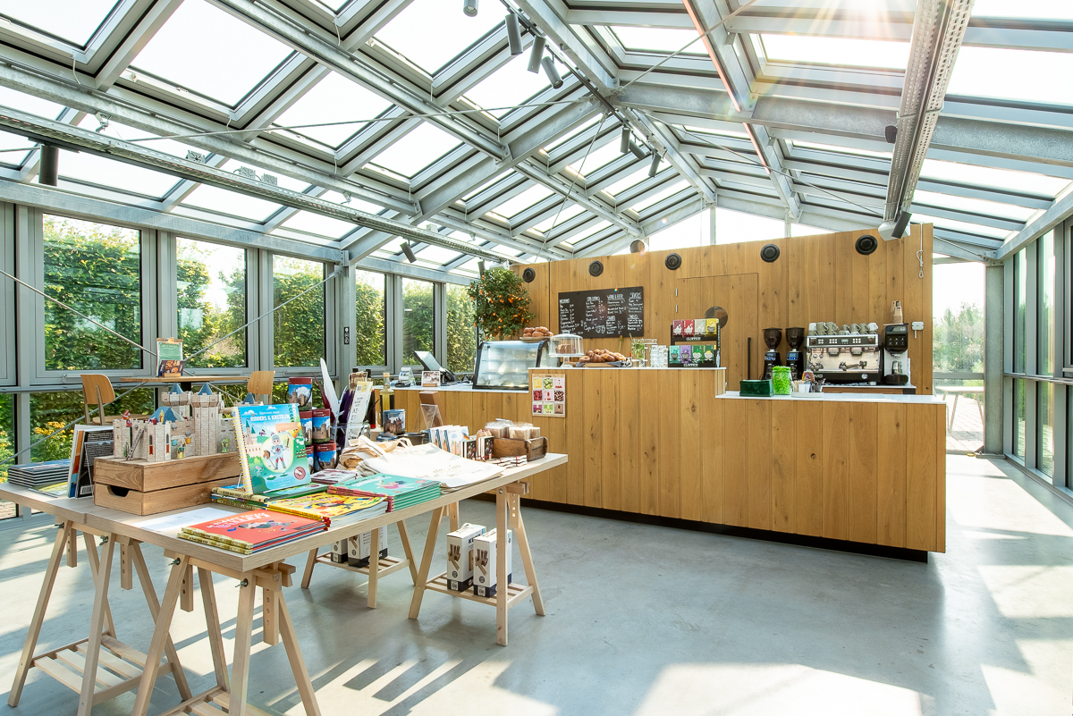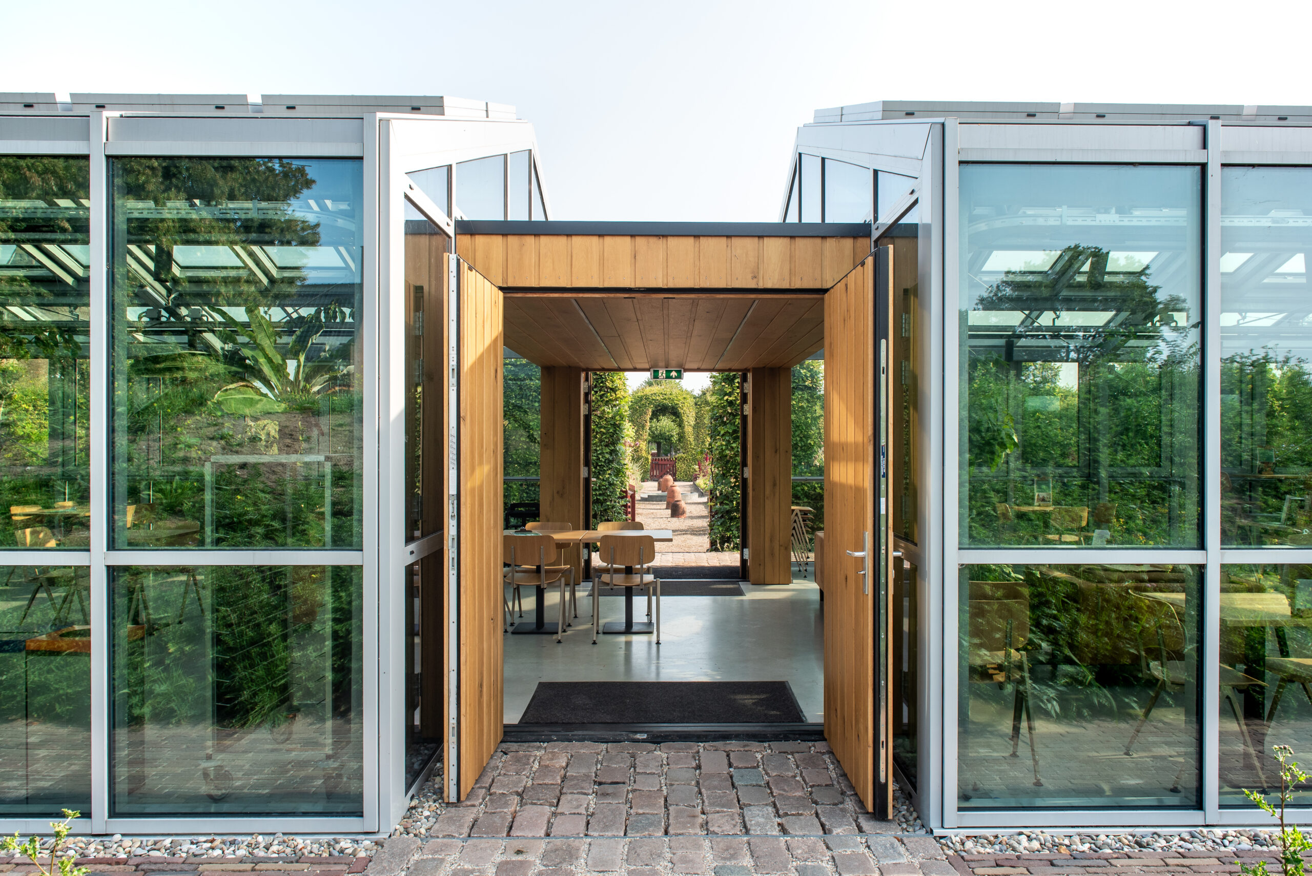 Het ontwerp van de ‘Tuinkamer’ is een toevoeging aan de tuinen zonder een doorn in het oog te zijn. Als verlenging aan de gangen en struiken strekt het zich uit aan de rand van het erf. De Tuinkamer is een sfeervolle kas, omringt en geïntegreerd in het groen van de omgeving. Dubbele kozijnen, een warmtepomp en ramen die computergestuurd open en dicht gaan zorgen voor temperatuurregulering en maken het horecapaviljoen jaarrond een fijne eet en drinkgelegenheid.