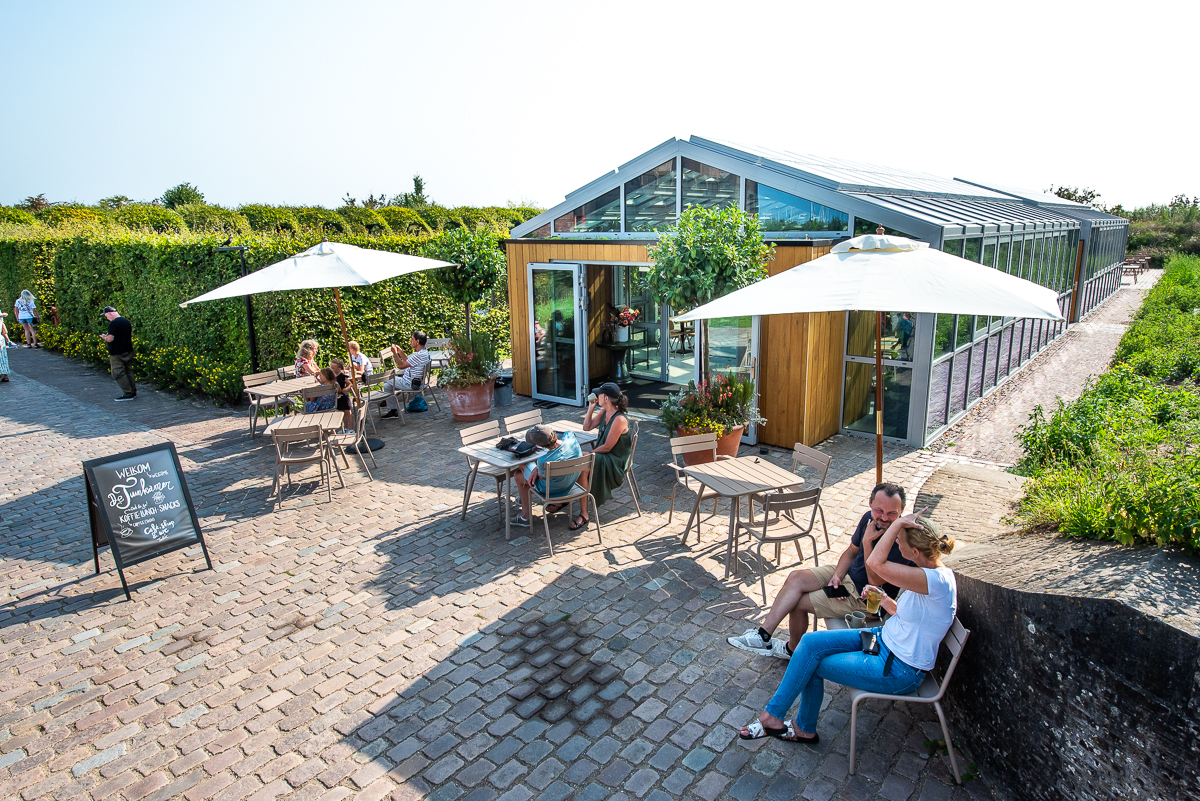 Het Rijksmuseum Muiderslot in Muiden is onderdeel van UNESCO Werelderfgoed als onderdeel van de Nieuwe Hollandse Waterlinie en de Stelling van Amsterdam. Op dit moment is het een rijk bezochte gelegenheid, met het kasteel, de tuinen, het waterschild en evenementen. Wij kregen de vraag om het museumcafé en giftshop, die origineel in het kasteel zelf bevonden, naar een vertaling in de kasteeltuin te maken. De tuinen, een spektakel van symmetrie en geschiedenis, zijn een kopie van de tuin die P.C. Hooft in de 17e eeuw liet aanleggen. Elk seizoen verandert het aanzicht en het verhaal aan de hand van de kleurrijke bloemen en geurende kruiden en dienen ze als proef, dwaal en leer gelegenheid.