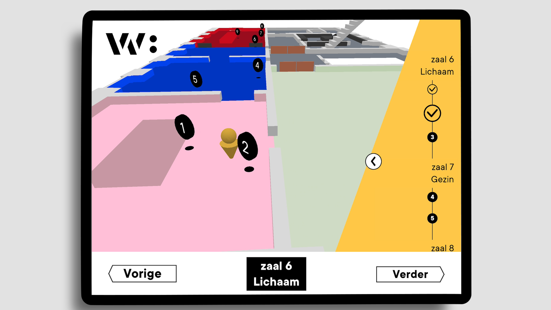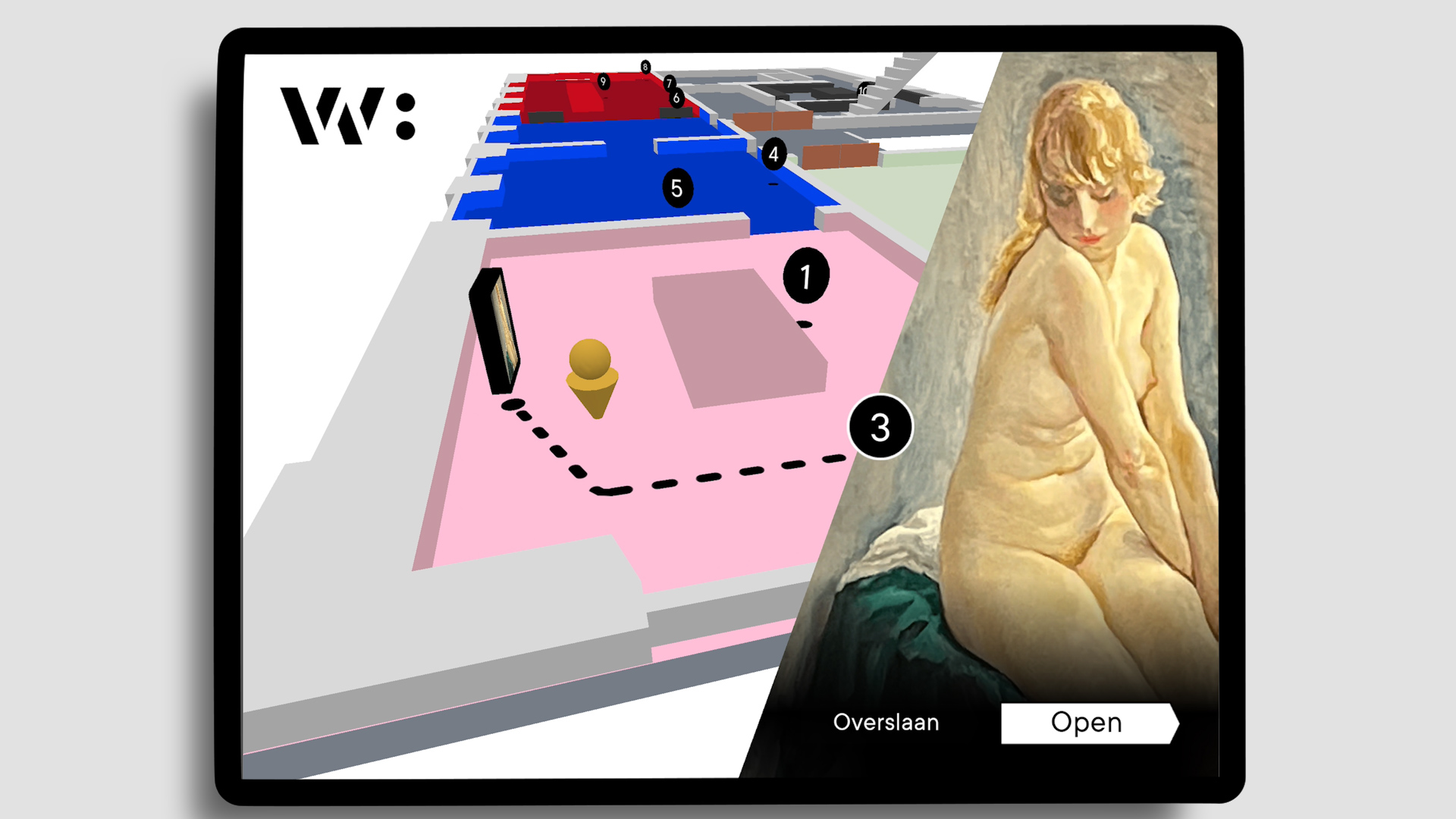 De digitale rondleiding, aangeboden op een tablet, vormt een ‘levensroute’ langs verschillende thema’s en verhalen die centraal staan in de collectiepresentatie. Dankzij slimme indoor navigatie worden bezoekers intuïtief van object naar object geleid. De route wijst vanzelf de weg door het museum, waardoor elke bezoeker zonder moeite de juiste volgorde en verdieping vindt.